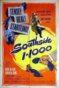Southside 1-1000 is a 1950 semidocumentary-style film noir directed by Boris Ingster featuring Don DeFore, Andrea King, George Tobias and Gerald Mohr as the off-screen narrator.[1] Based on a true story, it is about a Secret Service agent (DeFore) who goes undercover and moves into a hotel run by a beautiful female manager (King), so that he can investigate a counterfeiting ring. The agent is up against hardened felons such as the gang member played by Tobias, an unusual example of casting against type for the typically comic actor. It is one of Ingster's two films noir, the other being Stranger on the Third Floor (1940), an early picture in the genre.