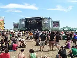 The name Southside refers to Southern Germany where the festival takes place. Festival organizers are FKP Scorpio and KOKO & DTK Entertainment. The festival site consists of 800,000 square meters of former military and airport precincts and features four stages. The festival first took place on the former military airport of Neubiberg (Munich) with approximately 15,000 visitors. In 2002, the number of visitors had risen to 30,000 and kept rising up to 60,000. The revenue for one festival weekend, according to the organizers, amounts to between five and ten million euros.[2] The paramedic service is provided by the Malteser Hilfsdienst, the Johanniter-Unfall-Hilfe (regional association Bodensee-Oberschwaben[3]) and the German Red Cross.[4] Throughout the entire weekend, around 400 helpers do approximately 12,000 hours of work.[5] Crowd surfing is strictly against the festival's safety policy.