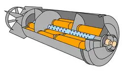 with a central ignition-explosive charge - the bomb design has a central perforated pipe with a charge and a side weakened section covered by a strip. When the fuse is triggered, the charge is initiated. The resulting gases destroy the cross-section of the bomb body and scatter aerial bombs, thereby achieving a large area of scattering of aerial bombs.[1]
