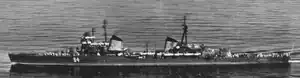 Kalinin was declared the best ship in the Pacific Fleet for her training performance during 1946, winning four prizes. The cruiser became part of the 5th Fleet between 17 January 1947 and 23 May 1953 when the Pacific Fleet was temporarily split. She went to sea in 1951 for gunnery testing under the flag of the 5th Fleet commander, Yury Panteleyev, with the commander-in-chief of the forces in the Far East, Marshal Rodion Malinovsky, and the Primorsky Military District commander, General Sergey Biryuzov observing the firing. Kalinin hosted Malinovsky, Nikita Khrushchev, Anastas Mikoyan, Nikolai Bulganin, and Admiral Nikolai Kuznetsov during their visit to the Pacific Fleet in October 1954 and demonstrated her main guns while they were aboard. She spent the post-war period on routine training missions until she was mothballed at Vladivostok on 7 May 1956. Kalinin was reactivated on 1 December 1957 before being disarmed and converted into a floating barracks on 6 February 1960, being renamed PKZ-21 on 14 March of that year. She was struck from the fleet on 12 April 1963,[14][15] before being transferred to Sovetskaya Gavan for scrapping on 10 August.[13]