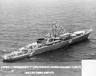 Bessmennyy was one of eleven Project 1135M ships launched between 1975 and 1981.[1] Project 1135, the Burevestnik (Russian: Буревестник, "Petrel") class, was envisaged by the Soviet Navy as a less expensive complement to the Project 1134A Berkut A (NATO reporting name 'Kresta II') and Project 1134B Berkut B (NATO reporting name 'Kara') classes of anti-submarine ships.[2] Project 1135M was an improvement developed in 1972 with slightly increased displacement and heavier guns compared with the basic 1135.[3] The design, by N. P. Sobolov, combined a powerful missile armament with good seakeeping for a blue water role.[1] The ships were designated Guard Ship (Сторожевой Корабль, SKR) to reflect their substantial greater anti-ship capability than the earlier members of the class, and the Soviet strategy of creating protected areas for friendly submarines close to the coast.[4][5] NATO forces called the vessels 'Krivak II'-class frigates.[6]
