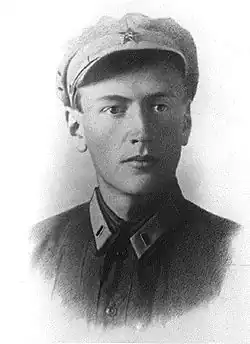 The Katyusha rocket launchers were top secret in the beginning of World War II, however only forty launchers had been built.[32] A special unit of the NKVD troops was raised to operate them.[33] On July 14, 1941, an experimental artillery battery of seven launchers was first used in battle at Rudnya in Smolensk Oblast of Russia, under the command of Captain Ivan Flyorov, destroying a concentration of German troops with tanks, armored vehicles and trucks at the marketplace, causing massive German Army casualties and its retreat from the town in panic,[34] see also in articles by a Russian military historian Andrey Sapronov,[35][36] an eyewitness of the maiden launches. Following the success, the Red Army organized new Guards mortar batteries for the support of infantry divisions. A battery's complement was standardized at four launchers. They remained under NKVD control until German Nebelwerfer rocket launchers became common later in the war.[37]