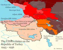 According to the memoirs of Nikita Khrushchev, the deputy premier Lavrentiy Beria pressed Joseph Stalin to claim eastern Anatolian territory that had supposedly been stolen from Georgians and Armenians by the Turks.[1] A large portion of the territorial claim corresponded to Western Armenia, which comprises a significant portion of the ancestral homeland of the Armenian people. The Soviet claims, if successful, would have strengthened the state's position around the Black Sea and would weaken British influence in the Middle East.[1]
