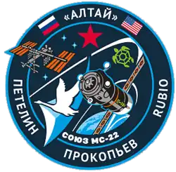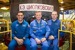 ![]() Launching mission insignia ![]() From left: Rubio, Prokopyev, and Petelin | |