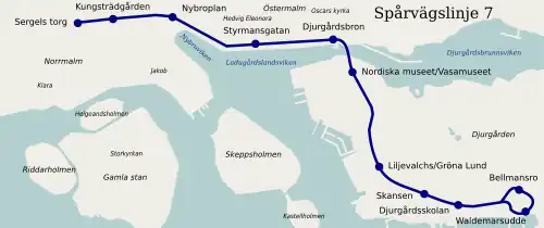 | 7 | T-Centralen – Waldemarsudde | 3.5 km (2.2 mi) | 11 |