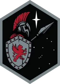 The SBD 41 emblem is a black hexagon with a silver gray outline representing Space Operations Command. The Centurion symbolizes strength, discipline, courage, and endurance. The constellation Orion embodies the spirit of a hunter. The four pointed star atop the badge is the star Polaris signifying a constant presence and vigilance in pursuit of excellence. The red griffin on the shield represents the strength of a lion and the flight of an eagle - a symbol of Schriever Space Force Base.[2]