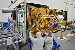 In 2014, Northrop Grumman began construction of several spacecraft bus components including the gyroscopes, fuel tanks, and solar panels.[31] On May 25, 2016, the spacecraft's panel integration was completed.[31] The overall spacecraft bus structure was completed by October 2015.[6] The spacecraft bus was assembled at facilities in Redondo Beach, California in the United States.[6] The completed spacecraft bus was powered on for first time in early 2016.[32]