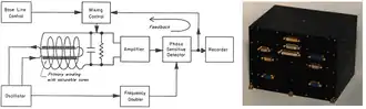 Search-coil magnetometers, also called induction magnetometers, are wound coils around a core of high magnetic permeability. Search coils concentrate magnetic field lines inside the core along with fluctuations.[6] The benefit of these magnetometers is that they measure alternating magnetic field and so can resolve changes in magnetic fields quickly, many times per second. Following Lenz's law, the voltage is proportional to the time derivative of magnetic flux. The voltage will be amplified by the apparent permeability of the core. This apparent permeability (μa) is defined as: