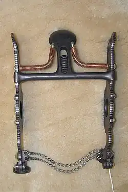 Traditionally, the vaquero method starts a young horse using a hackamore,[6] which is headgear with no bit that uses a heavy rawhide noseband, called a bosal, to control the horse. Then the horse moves to lighter bosals, and next into a combination of headgear that represents a transitional period in its training; a bridle with a type of curb bit called a "half breed" which is worn in conjunction with a light bosal. The rider carries two sets of reins, one set on the bosal and one on the curb, giving this gear its name, the "two-rein.[1][7] After several years in a two-rein, the horse graduates into the spade bit.[1] A light bosal called a bosalito remains on the horse by tradition, usually without reins attached.