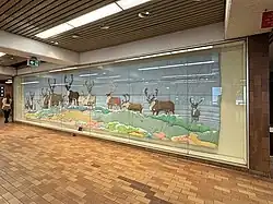 This building includes two large artworks: Morning Glory by Louis de Niverville, a surreal enamel mural sited on the ground level by the stairwell; and Barren Ground Caribou by Joyce Wieland, a huge quilt[9] featuring caribou in a tundra landscape, located near the unstaffed turnstile on the concourse level below.[10] In 2025, Barren Ground Caribou was temporarily removed so it could be featured in a major retrospective of Wieland's work at the Montreal Museum of Fine Arts and the Art Gallery of Ontario. It was scheduled to be reinstalled in 2026.[11]