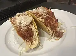 Spaghetti tacos are a variety of taco that originated as a running joke on the Nickelodeon teen sitcom iCarly. The dish consists of spaghetti and tomato sauce inside hard taco shells. In the television show, spaghetti tacos were invented by the character Spencer Shay, the older brother of the titular character, in an episode that first aired in October 2007.[1][2]