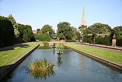 Spalding War Memorial is a First World War memorial in the gardens of Ayscoughfee Hall (pronounced /ˈæskəˌfiː/) in Spalding, Lincolnshire, in eastern England. It was designed by the architect Sir Edwin Lutyens. The proposal for a memorial to Spalding's war dead originated in January 1918 with Barbara McLaren, whose husband and the town's Member of Parliament, Francis McLaren, was killed in a flying accident during the war. She engaged Lutyens via a family connection and the architect produced a plan for a grand memorial cloister surrounding a circular pond, in the middle of which would be a cross. The memorial was to be built in the formal gardens of Ayscoughfee Hall, which was owned by the local district council. When McLaren approached the council with her proposal, it generated considerable debate within the community and several alternative schemes were suggested. After a public meeting and a vote in 1919, a reduced-scale version of McLaren's proposal emerged as the preferred option, in conjunction with a clock on the town's corn exchange building.
