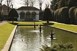 A Stone of Remembrance is sited on a platform of three steps in front of the pavilion, inscribed with the phrase "THEIR NAME LIVETH FOR EVERMORE" and the dates of the two world wars (the dates of the Second World War were added at a later date, though the names of the casualties from that conflict were not[16]). The stone is carved from a single piece of rock, with very slight curvature (entasis) barely visible to the naked eye. It is 12 feet (3.7 metres) long and devoid of any decoration besides the inscription. A long pool leads away from the structures – originally a canal from the garden first recorded in 1732, which Lutyens remodelled to form a reflecting pool in the style of an Italian formal garden; three low fountains were added at a later date. The pavilion and the pool are surrounded by yew hedges, which on the east side are broken at regular intervals by iron gates which lead to a peace garden, added in 1994.[1][14][17][18] The view of the pavilion at the head of the reflecting pool is reminiscent of Bodnant Garden at Lord Aberconway's home in Wales, Francis McLaren's childhood home.[19]