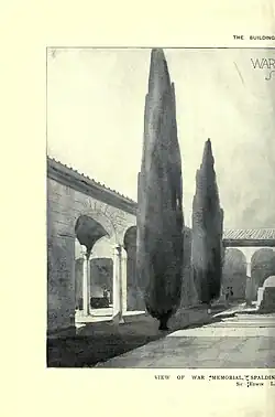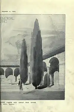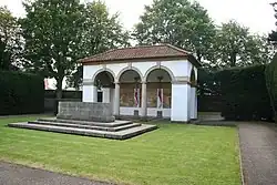 By the time the memorial at Spalding was unveiled in 1922, Lutyens had already been engaged in work on First World War memorials in Britain and abroad for several years. He had designed The Cenotaph on Whitehall in London (the permanent version of which was unveiled in 1920), which became the focus for the national Remembrance Sunday commemorations. His work from 1917 for the Imperial War Graves Commission (eventually as one of the Principal Architects for France and Belgium) included the Stone of Remembrance (used in the first cemeteries from 1920) and the Thiepval Memorial to the Missing (unveiled in 1932, still the largest British war memorial in the world). The Cenotaph and Lutyens's connections from his pre-war work designing country houses led to commissions for dozens of war memorials across Britain and elsewhere in the Commonwealth.[1] His initial design for Spalding was one of several of Lutyens's early post-war commissions featured in a war memorials exhibition hosted by the Royal Academy at the Victoria and Albert Museum in London in 1919.[20] Historic England described Spalding as "an exceptional departure" from the usual style of Lutyens's war memorials.[1] The design is not used elsewhere in his war memorials, but the pavilion had a significant influence on Lutyens's later designs for buildings in Imperial War Graves Commission cemeteries on the Western Front.[1] The resemblance is said to be "striking" at Anneux British Cemetery, Cambrai, and the Tuscan loggia motif recurs at several other cemeteries as well.[21]