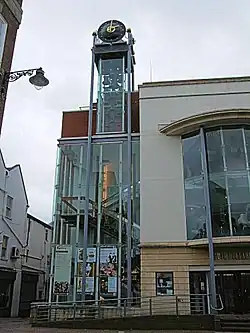 The clock and carillon (bell tower) of 23 bells was erected in 1922, the same year as Lutyens's memorial, on the corn exchange in the town centre. Three of the bells were inscribed with names of casualties from the war, chosen to represent all of Spalding's war dead, while others were inscribed with names of those involved in the commemorations. The corn exchange was demolished in 1972 and replaced with the South Holland Centre, an arts venue, with the clock and carillon re-housed in a tower on the roof. After refurbishment of the South Holland Centre in 1998, a new glass tower was built to house the clock and carillon after the bells were cleaned. On Armistice Day (11 November) 1998, the Western Front Association unveiled a plaque on the South Holland Centre to explain the significance of the clock tower.[8][9]