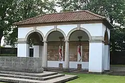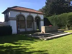 Spalding's war memorial comprises a brick-built pavilion structure with hipped roof of red pantiles and floored with red bricks in a herringbone pattern. The side of the pavilion facing the pool has three Tuscan stone arches, with another Tuscan arch opening on each sidewall. The solid rear wall bears two painted stone flags – the Union Flag to the left and the White Ensign to the right – and three panels on which are inscribed the names of more than two hundred servicemen from Spalding who died in the First World War. The central panel bears the dedication: "IN LOVE AND HONOUR OF THOSE WHO GAVE THEIR LIVES FOR THEIR COUNTRY IN THE YEARS OF WAR MCMXIV – MCMXIX / THIS MEMORIAL IS RAISED IN THEIR HOME BY THE MEN AND WOMEN OF SPALDING". The frieze inside the pavilion contains a further inscription: "ETERNAL REST GRANT TO THEM O LORD AND LET LIGHT PERPETUAL SHINE UPON THEM".[1][14] A separate stone is dedicated to Francis McLaren and inscribed "THIS STONE COMMEMORATES FRANCIS WALTER STAFFORD McLAREN MEMBER OF PARLIAMENT FOR THE SPALDING DIVISION 1910–1917 WHEN HE FELL IN THE SERVICE OF HIS COUNTRY AT THE AGE OF 31".[15]