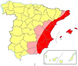 The Levante (Spanish: [leˈβante]; Catalan: Llevant [ʎəˈβan, ʎəˈvant, ʎeˈβan, ʎeˈvant]; "Levant, East") is a name used to refer to the eastern region of the Iberian Peninsula, on the Spanish Mediterranean coast. It roughly corresponds to the former Xarq al-Ándalus, but has no modern geopolitical definition. Rather, it broadly includes the autonomous communities of Valencia (provinces of Alicante, Castellón and Valencia), Murcia, Catalonia (Barcelona, Girona and Tarragona), the eastern part of Castile-La Mancha (Albacete and Cuenca), eastern Andalusia (Almería, Granada and Jaén), southern Aragon (Teruel) and the Balearic Islands.