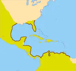 Spanish possessions (yellow) in the Caribbean region around 1650, with the coastline of the Spanish Main indicated (thick maroon line). | |