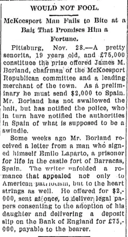 - ^ "AN OLD SWINDLE REVIVED.; The "Spanish Prisoner" and Buried Treasure Bait Again Being Offered to Unwary Americans". The New York Times. 20 March 1898. p. 12. Retrieved 2010-07-01.