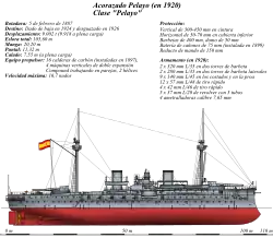 Spain remained neutral during World War I, which began late in July 1914 while Pelayo was stationed at Palma de Mallorca in the Balearic Islands with four torpedo boats.[3] On 29 June 1916, she joined the gunboats Bonifaz and Álvaro de Bazán in bombarding several enemy positions in Morocco.[3] In January 1917 a French merchant ship collided with her and damaged her bow while she was visiting Tangier.[3] Her commanding officer died of a heart attack on 28 November 1917 while she was at Tangier.[3]
