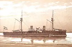 Under the command of Capitán de navío (Ship-of-the-Line Captain) Pascual Cervera y Topete, a future contralmirante (counter admiral) who had supervised her construction, Pelayo made her delivery voyage late in 1888.[3] She received her battle ensign, donated by Asturias and embroidered in Gijón.[3] She returned to Toulon in January 1889 for modifications and improvements.[3] After their completion, she returned to Spain in September 1889 and was assigned to the Training Squadron.[3]