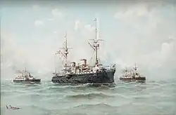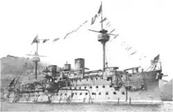 Cámara's squadron — consisting of Pelayo, the new armored cruiser Emperador Carlos V, the auxiliary cruisers Patriota and Rapido, the destroyers Audaz, Osado, and Proserpina, and the transports Buenos Aires and Panay — sortied from Cádiz on 16 June 1898[3][7] and passed Gibraltar on 17 June 1898.[8] It arrived at Port Said, Egypt — where the destroyers were scheduled to part company with the squadron and return to Spain[3] — on 26 June 1898[3] and requested permission to transship coal,[9] which the British government, which controlled Egypt at the time, finally denied on 30 June 1898 out of concern that it would violate British and Egyptian neutrality.[10] Cámara's squadron began its southward transit of the Suez Canal on 4 July,[3] and by the time it arrived at Suez on 5 July 1898, the squadron of Viceadmiral (Vice Admiral) Pascual Cervera y Topete had been annihilated in the Battle of Santiago de Cuba off southeastern Cuba on 3 July, freeing up the U.S. Navy's heavy forces from the blockade of Santiago de Cuba. Fearful for the security of the Spanish coast, the Spanish Ministry of the Navy recalled Cámara's squadron as it steamed through the Red Sea on 7 July 1898,[11] and it returned to Spain, making stops at Mahón on Menorca in the Balearic Islands on 18 July[3] and at Cartagena on either 20[3] or 23 July[10], according to different sources, before arriving at Cadiz,[10] where it was dissolved on 25 July 1898.[1]