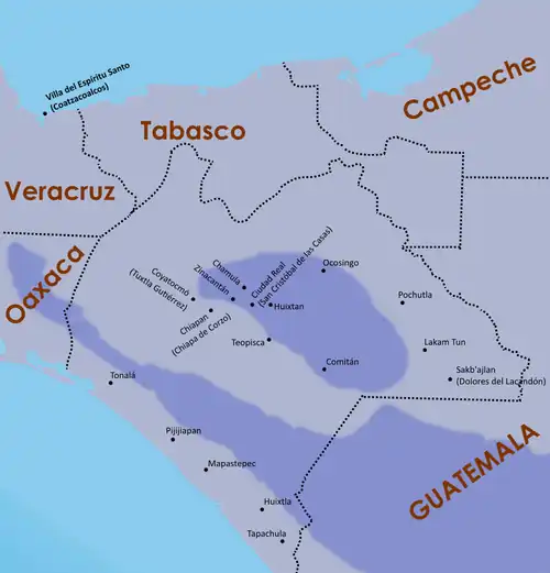 - ^ The term Chiapas refers to the territory incorporated into the modern Mexican state of Chiapas. Chiapan was used to identify the city of the Chiapanecas, Chiapan is now known as Chiapa de Corzo. Chiapa was the name used to refer to the highland colonial province, which did not include Soconusco.[1]