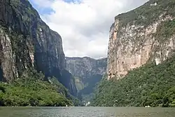 The Depresión Central consists of a drainage basin some 200 kilometres (120 mi) long and varying in width from 30 to 60 kilometres (19 to 37 mi). The Grijalva River is fed by drainage from the Cuchumatanes mountains of Guatemala and from both of the Chiapas highland regions, particularly the Sierra Madre. The wide plains feature a hot climate with moderate rainfall. The Depresión Central is itself divided into two zones, the eastern is the Grijalva Valley stretching from the Guatemalan border to the Sumidero Canyon;[5] the western zone is the Meseta Central, or Central Plateau, in colonial times referred to as the Valle de Jiquipilas y Cintalapa. This region of high plains blocks the passage of the Grijalva River, which has cut its way through towards Tabasco by means of the Sumidero Canyon.[8] Los Chimalapas is another highland region at the northern extreme of the Meseta Central and bordering with Oaxaca; it is considered the first upthrust of the Sierra Madre.[9]