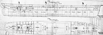Pampero was to be 231 feet (70 m) in length, 33 feet (10 m) in breadth, powered by both sail and steam. Bark rigged, she was equipped for cruising under canvas or steam, with telescopic funnels, and a raise-able screw.[6] Similar, but larger engines to Alabama were placed below the waterline for protection. Her frame was iron, with a mixture of iron and wood for the planking.[6] Her armament was to be three 8-inch (203 mm) pivot guns, and a broadside battery of four or more guns. The original contract called for Pampero to be ready for sea by July 1863, but the schedule could not be maintained. Guns and gun carriages were ordered, and Sinclair received £10,000 ($40,000) from Bulloch, and perhaps more. For his crew, Sinclair made arrangements for some men to come out from Baltimore.[7] By the spring of 1863, Sinclair was becoming very concerned about Pampero, and feared that the British government would not permit the departure of any vessel suspected to be Confederate.[7]