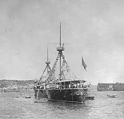Selected to represent the Spanish Navy at a naval review at Spithead in honor of the Diamond Jubilee of Queen Victoria, celebrating the 60th anniversary of her coronation, Vizcaya got underway from Cádiz at 06:00 on 12 June 1897 as the flagship of Contraalmirante (Counter Admiral) Segismundo Bermejo y Merelo, the Training Squadron's commander.[1] In England, she received a representative of the Spanish colony in England on board and took part in the review on 26 June before returning to Spain at Ferrol at the beginning of July 1897.[1]