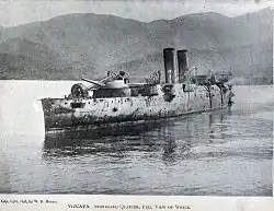 Vizcaya continued her assignment to the Training Squadron during 1896 and was anchored at Barcelona from 17 June to 19 July 1896.[1] On 23 February 1897 she suffered hull damage when the mail steamer Menorquín collided with her at Mahón. Vizcaya underwent repairs at Mahón.[1]