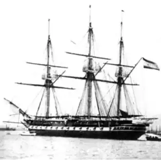 She had a John Penn and Sons steam engine rated at a nominal 600 horsepower (447 kW)[5] which, with her four boilers, gave her a speed of 12 knots (22 km/h; 14 mph).[1] She could carry up to 360 tons of coal.[1] Her armament consisted of a 220-millimetre (8.7 in) swivel gun on her bow, twenty 68-pounder (31 kg) 200-millimetre (7.9 in) smoothbore guns, eight 32-pounder (14.5 kg) 160-millimetre (6.3 in) smoothbore guns, eight 32-pounder (14.5 kg) 160-millimetre (6.3 in) rifled guns, and six bronze guns — two 150-millimetre (5.9 in) howitzers, two 120-millimetre (4.7 in) rifled guns, and two 80-millimetre (3.1 in) rifled guns — for disembarkation and use in her boats.[1] She had a crew of 500 men.[1]