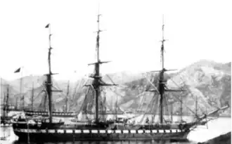 Méndez Núñez's squadron spent the next several days at San Lorenzo Island just off Callao, making repairs and tending to casualties. The Chincha Islands War ended in a ceasefire on 9 May 1866, Villa de Madrid having suffered a total of 74 men dead or wounded during the war.[1] On 10 May 1866, Mendez Núñez's squadron burned and scuttled Paquete de Maule and departed South American waters.[1] Mendez Núñez viewed an eastward passsage around Cape Horn in winter as too dangerous for his damaged ships, so he decided to steam west across the Pacific Ocean. He divided the squadron, sending Berenguela, Numancia, Vencedora, and three auxiliary ships to the Philippines for repairs while he led the rest of the ships on a voyage across the Pacific, Indian, and Atlantic Oceans to Rio de Janeiro, Brazil, with Villa de Madrid as his flagship.[7][15][16][17][18] Villa de Madrid passed around the Cape of Good Hope under sail in winter without warm clothing or fresh food, and scurvy broke out among her crew.[1] By the time the squadron had crossed the South Atlantic Ocean and made port at Rio de Janeiro on 24 June 1866, completing a circumnavigation of the world,[18] 31 members of Villa de Madrid′s crew had died and 350 more were sick.[1]
