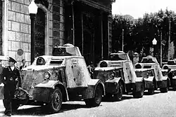 Governmental response to military conspiracy was rather cautious. State security gathered some circumstantial evidence in wake of the called-off coup of April 20, but neither legal nor disciplinary action has been taken. Generals suspected of mischief were moved within the military structures; Rodríguez del Barrio was dismissed as inspector general; Villegas, Saliquet, González Carrasco and Fanjul were moved to the "disponibles forzosos" category, Orgaz was sent to the Canary Islands and Varela to Cádiz.[86] In May a successful action of security services unearthed hundreds of fake Guardia Civil uniforms in Madrid, but this was part of an independent Carlist scheme, only loosely related to military conspiracy.[87] Later in May Mallol presented Casares and Azaña with a list of 500 conspirators whom he believed should be arrested immediately, but the two did not act.[88] Once informers started pointing to Mola, in early June Mallol raided Pamplona with DGS men, but they failed to find any firm evidence and counter-action was limited to detentions of secondary figures, like colonel Utrilla.[89] However, alarming news kept coming: information about unusual officers' meetings in the barracks, discovery of non-evidenced firearms stocks, identification of strange arrangements in arms factories, cryptic conversations on tapped phone lines, UMRA warnings related to specific commanders, and intercepted written messages.[90] On June 28 Mallol was in Pamplona again, but this time he spoke only to the civil governor, Menor Poblador.[91]