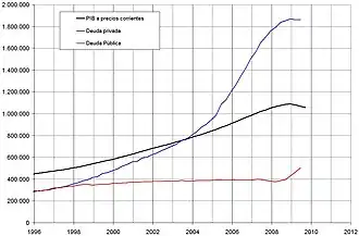 One of the main effects of this situation is the growth of household debt. Since usually the purchase of housing, whether to live in or to invest, is financed with mortgage loans, the price increase implies an increase in debt. Spanish consumer debt tripled in less than ten years. In 1986, debt represented 34% of disposable income, in 1997 it rose to 52%, and in 2005 it came to 105%. In 2006, a quarter of the population was indebted with maturities of more than 15 years.[23] From 1990 to 2004, the average length of mortgages increased from 12 to 25 years.[24] The Bank of Spain reported that household savings in 2006 had been overwhelmed by debt.[25] In fact, the Bank of Spain has warned each year about the high rates of indebtedness of Spanish households,[26] which according to the institution was unsustainable. Private debt stood at 832.289 billion euros at the end of 2006, an increase of 18.53% year-on-year, and reached 1 trillion euros by the end of 2010.[27] The Bank of Spain also warned on the excessive indebtedness of the construction industry.[28]