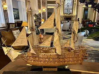 The Battle of Trafalgar is the historical feat in which she participated and of which we have the best account. In spite of being dismasted by Admiral Nelson's artillery on 21 October 1805, she achieved glory in this battle under the command of the commander Don Cosme Damian Churruca and constituted for the Spaniards a handsome example of the heroism of their nation and the bravery of their sailors.