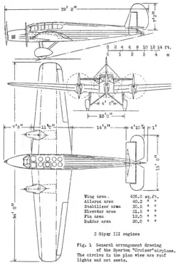 The Spartan Cruiser was a three-engined transport monoplane. It had a relatively clean exterior which noticeably contributed to the aircraft's performance.[11] Specifically, the aircraft possessed a greater than average aerodynamic efficiency and a particularly low minimum drag coefficient. Furthermore, the Cruiser had a gross weight to tare weight ratio, when configured as a passenger aircraft, of 1.53, while its freighter guise reportedly achieved 1.65; both values were favourable for the era and indicative considerable engineering skill in respect to the aircraft's structural design.[12] When configured as a freighter, which involved the removal of the cabin furnishings, the aircraft could carry a payload of 1,000 lb, or 2.78 lb per horsepower. In such a configuration, the aircraft could achieve an endurance of six hours and a cruising range of approximately 700 miles, although the payload could be increased beyond this if the distance of the journey was shortened.[12] The aircraft was, even when fully loaded, capable of gaining altitude with any one of its three engines stopped.[13]
