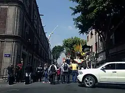 With filming completed in Rome, production moved to Mexico City in late March to shoot the film's opening sequence. Scenes for the Day of the Dead festival filmed in and around the Zócalo and the Centro Histórico district, including at the Gran Hotel Ciudad de México.[86][87] At the time, no such Day of the Dead parade like the one from the film took place in Mexico City; in 2016, due to the interest raised by Spectre and the government's desire to promote the pre-Hispanic Mexican culture, the federal and local authorities decided to organise an actual "Día de Muertos" parade through Paseo de la Reforma and Centro Histórico on 29 October 2016, which was attended by 250,000 people.[88][89] The film opens with a long take that joins six shots seamlessly, and was one of the few scenes that required previsualisation. Through extensive planning, filming did not require motion control cameras. The scene joints were done in post-production through re-timing and re-projections, which even matched Mexico locations with interiors filmed at Pinewood.[73]