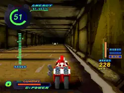 Stages in Speed Power Gunbike are presented in 3D with a third-person perspective of the player character. The objective is to reach the end of each stage while avoiding obstacles, breaking through barriers, battling enemies, and then defeating a boss in a large arena. The player is tasked with doing all this while keeping watch on the Gunbike's "Anergy" meter, which acts as both health and a time limit and slowly ticks down from its full tank of 99, shown on a heads-up display (HUD). The meter drops rapidly every time damage is taken from enemies and will result in a game over should it hit zero.[6][7] Bonus items can be picked up to refill the meter.[5] Gunbikes can transform into three different modes. These modes can swapped between at any time with each one having different control schemes and certain advantages over the others.[5]