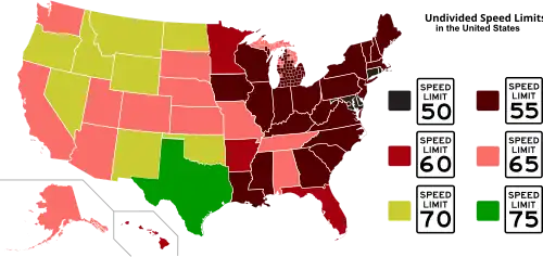 The highest speed limits are generally 70 mph (113 km/h) on the West Coast and the inland eastern states, 75–80 mph (121–129 km/h) in inland western states, along with Arkansas, Louisiana, Maine, and Michigan; and 65–70 mph (105–113 km/h) on the Eastern Seaboard. Alaska, Connecticut, Delaware, Massachusetts, New Jersey, New York,[1] Puerto Rico, Rhode Island, and Vermont have a maximum limit of 65 mph (105 km/h), and Hawaii has a maximum limit of 60 mph (97 km/h). The District of Columbia and the U.S. Virgin Islands have a maximum speed limit of 55 mph (89 km/h). Guam and the Northern Mariana Islands have speed limits of 45 mph (72 km/h). American Samoa has a maximum speed limit of 30 mph (48 km/h).[2] Two territories in the U.S. Minor Outlying Islands have their own speed limits: 40 mph (64 km/h) in Wake Island, and 15 mph (24 km/h) in Midway Atoll.[3][4] Unusual for any state east of the Mississippi River, much of Interstate 95 (I-95) in Maine north of Bangor allows up to 75 mph (121 km/h), and the same is true for up to 600 mi (966 km) of freeways in Michigan. Portions of the Idaho, Montana, Nevada, North Dakota, Oklahoma, South Dakota, Texas, Utah, and Wyoming road networks have 80 mph (129 km/h) posted limits. The highest posted speed limit in the country is 85 mph (137 km/h) and can be found only on Texas State Highway 130, a toll road that bypasses the Austin metropolitan area for long-distance traffic. The highest speed limit for undivided roads is 75 mph (121 km/h) in Texas. Undivided road speed limits vary greatly by state. Texas is the only state with a 75 mph (121 km/h) speed limit on 2 lane undivided roads, while most states east of the Mississippi are limited to 55 mph (89 km/h).