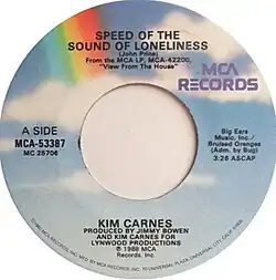 "Speed of the Sound of Loneliness" is a song written by American singer-songwriter John Prine and recorded on his 1986 album German Afternoons. The song was covered by American singer-songwriter Kim Carnes, who released it as a single from her 1988 album View from the House. Carnes' version reached number 70 on the Billboard Hot Country Songs chart.[1] The song gained further fame with a duet recording by Prine and American singer Nanci Griffith on the latter's 1993 album Other Voices, Other Rooms[2] and the release of the track as a single.