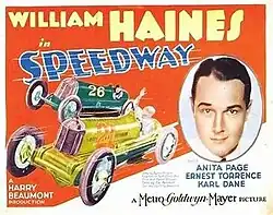 Speedway is a 1929 American synchronized sound drama film directed by Harry Beaumont and starring William Haines, Anita Page and Ernest Torrence. The film has no audible dialogue but featured a synchronized musical score and sound effects. The soundtrack was recorded using the Western Electric Sound System sound-on-film process. The soundtrack was also transferred to discs for those theatres that were wired with sound-on-disc sound systems. This was Haines' last film without dialogue.