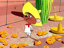 Speedy Gonzales is an animated cartoon character in the Warner Bros. Looney Tunes and Merrie Melodies series of cartoons. He is portrayed as "The Fastest Mouse in all Mexico" with his major traits being the ability to run extremely fast, being quick-witted and heroic, and speaking with a Mexican accent.[1] He usually wears a yellow sombrero, white shirt and trousers (which was a common traditional outfit worn by men and boys of rural Mexican villages), and a red kerchief, similar to that of some traditional Mexican attires.[2] There have been 46 theatrical shorts made either starring or featuring the character.