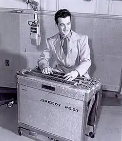 Wesley Webb West (January 25, 1924 – November 15, 2003), better known as Speedy West, was an American pedal steel guitarist and record producer. He frequently played with Jimmy Bryant, both in their own duo and as part of the regular Capitol Records backing band for Tennessee Ernie Ford and many others. The duo also recorded with non-Capitol artists in Los Angeles. In 1960, Speedy played on and produced Loretta Lynn's first single. During his time at Capitol, he played on over 6000 recordings, including pop records by artists like Frank Sinatra and Bing Crosby.[1] West, who began playing Paul Bigsby's second ever pedal steel guitar in 1947,[1] was the first country steel guitarist to use a pedal guitar. Nashville players like Bud Isaacs would adopt it in the early 1950s. After a stroke in 1981, West was unable to play pedal steel, but would continue to attend steel guitar conventions.