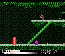 Two distinct meters keep track of the character's well-being in the game; a "life" meter helps to govern the player's stamina while a "Toku" meter helps to govern the player's morality level. Killing undead creatures improves the player's "Toku" rating. Players can choose from three character classes: explorer, clergy or esper.[8] While the explorer is basically a variation from the original Spelunker character, the Esper is an adept magic user with the ability to throw thunderbolts while the clergy member can shoot out fireballs at the enemy.[7] The number of days that have elapsed in-game in addition to the current in-game time is included and is vital for certain tasks.[9] If the player falls down a pit while having a high "Toku" rating; he is revived at a minimum cost. Suffering that same fate with a low "Toku" meter causes the player to descend to eternal damnation in Hell, thus ending the game.[6]