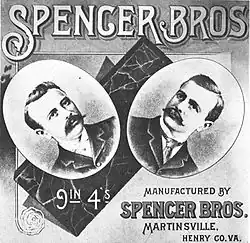 The Spencer family also controlled the Danville & Western Railroad (later merged into the Southern Railway), which terminated in the town, as well as a small collection of other buildings, including a post office, doctor's house and other appurtenances.[7] The family later sold their tobacco company to the R. J. Reynolds Tobacco Company[8] in one of the first consolidations in the industry. The firms of D. H. Spencer and Sons and Spencer Brothers agreed in December 1903 to form a corporation with Reynolds in return for stock in the enterprise. R. J. Reynolds had grown up in nearby Critz, Virginia, and he and the Spencers were bitter rivals.