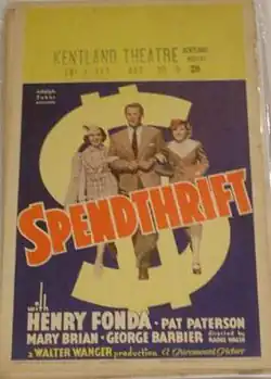 Spendthrift is a 1936 American romantic comedy film directed by Raoul Walsh and starring Henry Fonda, Pat Paterson, Mary Brian and George Barbier. It was produced by Walter Wanger for release by Paramount Pictures.[2]