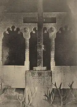 The interior is covered with barrel vaulting, on three supporting arches, and the wall is divided longitudinally into flank arcades. Below there is a small niche at each side of the apse, while higher up are large recesses which, on the east, open outwards in circular apertures, with carved casting. These recesses correspond to the prothesis and diakonikon. The church has preserved its high iconostasis, which is contemporaneous with the church and has been removed to the Georgian National Museum in Tbilisi for safekeeping. It is covered with grass ornamentation, but the colors have faded, owing to the moisture. The iconostasis is built of alabaster-stucco, and consists of three arches and four pillars, with a royal door in the middle. In front of the royal doors, on a rectangular stone pedestal, stands a massive wooden cross, once covered with sheets of silver, but now bare. The church was greatly revered by hunters and many deers' horns used to be displayed in the building.[3]