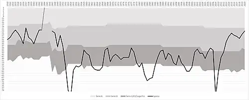 Promotion back to Serie C in 1958 marked the beginning of a period in which the club bounced back and forth between the third and fourth levels of Italian football, a cycle that would continue until finally returning to Serie B in the 2000s. The most consistent spell in a single division was Spezia's run in Serie C from 1966 to 1979, when the club finished in 17th position and was again relegated to the fourth-division Serie C2. Spezia returned the next year with another promotion but again fell back down in 1981. Another spell in Serie C was to follow from 1986 to 1997, when the club returned to the fourth tier once more. The name of the club was changed to its current name Spezia Calcio in 1995.