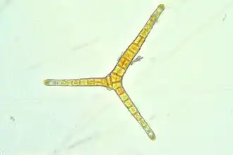 Sphacelaria is mainly characterized by the blackening of their cell walls when treated with bleach, polystichous (parenchymatous) filamentous thallus, hemiblastic branching (i.e. laterals arise from the secondary), and leptocaulus growth (i.e. uniform size of filaments, such as their mature segments have almost the same diameter as their apical ones); moreover majority of the species also have specialized branchlets for vegetative reproduction called propagules.[4][9][10][6] Delineation of Sphacelaria species have been traditionally based on morphological differences, especially the variation among the propagule shape, cell dimensions, and cell arrangement of the propagules.[4] In terms of cellular ultrastructure, Sphacelaria cells contain discoid chloroplasts and do not have pyrenoids.[1]